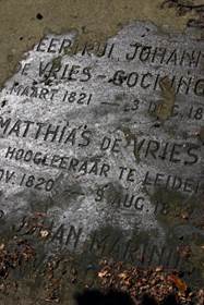 Weinig Leidse hoogleraren hebben in de 19de eeuw zo aan de weg getimmerd als de Leidse hoogleraar Matthijs de Vries, die aan onze universiteit taal-, letterkunde en geschiedenis doceerde. Van dat laatste werd hij verlost toen Robert Fruin dat van hem overnam. Roem en schande werden De Vries’ deel als grondlegger van wat het grootste woordenboek ter wereld zou gaan worden, het Woordenboek der Nederlandsche Taal. Samen met Lammert Allard te Winkel (beiden waren leraren aan het Leids gymnasium) was hij ook verantwoordelijk voor de spelling van versch vleesch en van bloote beenen, een spelling waarmee de meeste van onze ouders zijn opgevoed. Vooral over deze twee onderwerpen, die ook nog eens onlosmakelijk met elkaar verbonden zijn, gaat deze lezing. Toch zullen diverse andere zaken niet onbelicht blijven, zoals De Vries als redenaar en De Vries als kind van zijn tijd. Ook zijn positie binnen de Groninger en Leidse Alma mater zullen de revue passeren en niet te vergeten zijn bemoeienis met het standbeeld van burgemeester van der Werf. Uiteindelijk zal iedere toehoorder evenwel de verzuchting van De Vries delen dat wie zijn vader en moeder heeft vermoord nog te goed is voor het woordenboekleven. | ![]() Graf Matthias de Vries op Groenesteeg |