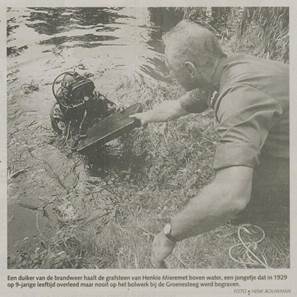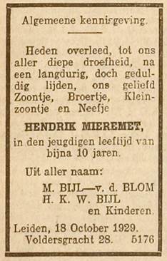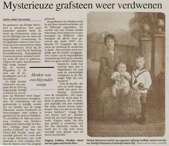 Regelmatig wordt gevraagd waarom de steen daar staat en niet tijdens de laatste restauratie is teruggeplaatst. Wij antwoorden dan dat Henkie hier niet begraven is. Waar hij dan wel begraven lag en waarom de steen hier staat, daar konden we geen antwoord op geven. Ger Koper heeft onderzoek gegaan en vond informatie over Henkie Mieremet in een overlijdens- advertentie en een dankbetuiging in het Leidsch Dagblad uit 1929. Uit de ‘Algemeene kennisgeving’ valt op te maken dat zijn moeder, weduwe van Johannes Mieremet, is hertrouwd met de heer H. K. W Bijl. Ger Koper achterhaalde ook een aantal artikelen uit het Leids Dagblad van 1995 over Henkie en zijn teruggevonden grafsteen in de Zijlsingel. Op 20 juli 1995 stond in het Leidsch Dagblad dat duikers de steen hadden gevonden en op 28 oktober van dat jaar was de grafsteen weer verdwenen. De heer Piet de Baar wist het volgende te vertellen: Henkie Mieremet, overleden 18 oktober 1929, werd 22 oktober d.a.v. op Rhijnhof begraven in het huur-zandgraf nr. 38, 2e klas. D.d. 9 april 1930 is het bewuste steentje op het graf geplaatst: schuinstaand, groot 50x35x5 cm. En wel door H.W.K. Bijl, Voldersgracht 28, stiefvader van de overledene. De moeder was Maria Blom. Voor het steentje was per jaar fl 1.50 aan rechten verschuldigd. |