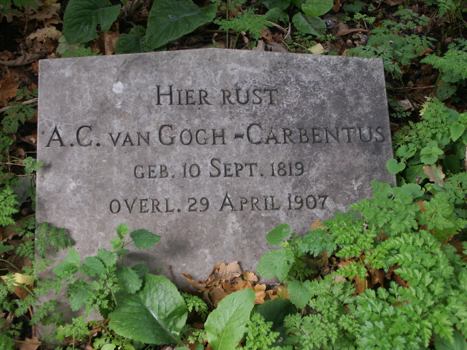 Anna Cornelia van Gogh- Carbentus is geboren op 10 september 1819 in Den Haag en trouwde in 1851 met Ds. Theodorus van Gogh in 1851 en werd op 30 maart 1853 in Groot-Zundert moeder van de beroemde schilder Vincent van Gogh. Na het overlijden van haar echtgenoot in 1885 verhuisde ze in 1889 naar Leiden, waar ze met twee dochters in het pand Herengracht 100 woonde. In 1893 vertrok ze naar Den Haag, maar keerde in 1905 terug naar Leiden, waar ze in het pand Zoeterwoudsesingel 45b overleed op 29 april 1907. Zij is begraven op 2 mei 1907 in vak K op no.754.