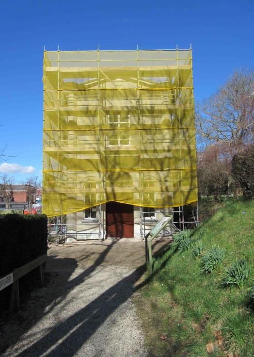 | Al een aantal maanden is onze aula ‘ingepakt’ met steigers in verband met de restauratie van dit monumentaal gebouw, sinds 1978 een rijksmonument. Aan de buitenkant wordt een aantal zaken gerepareerd en/of vernieuwd. Ook wordt de aula in de oorspronkelijke kleuren geschilderd en krijgt daarom een ‘ander gezicht’. De bovenverdieping ondergaat een grondige opknapbeurt en wordt geschikt gemaakt voor bewoning. De gemeente Leiden, eigenaar van de begraafplaats incl. de aula, financiert deze zaken. |