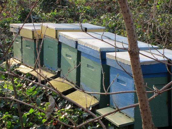 Halverwege het knekelveld staat sinds 2002 een aantal bijenkasten van de Leidse imker Bram de la Rie.