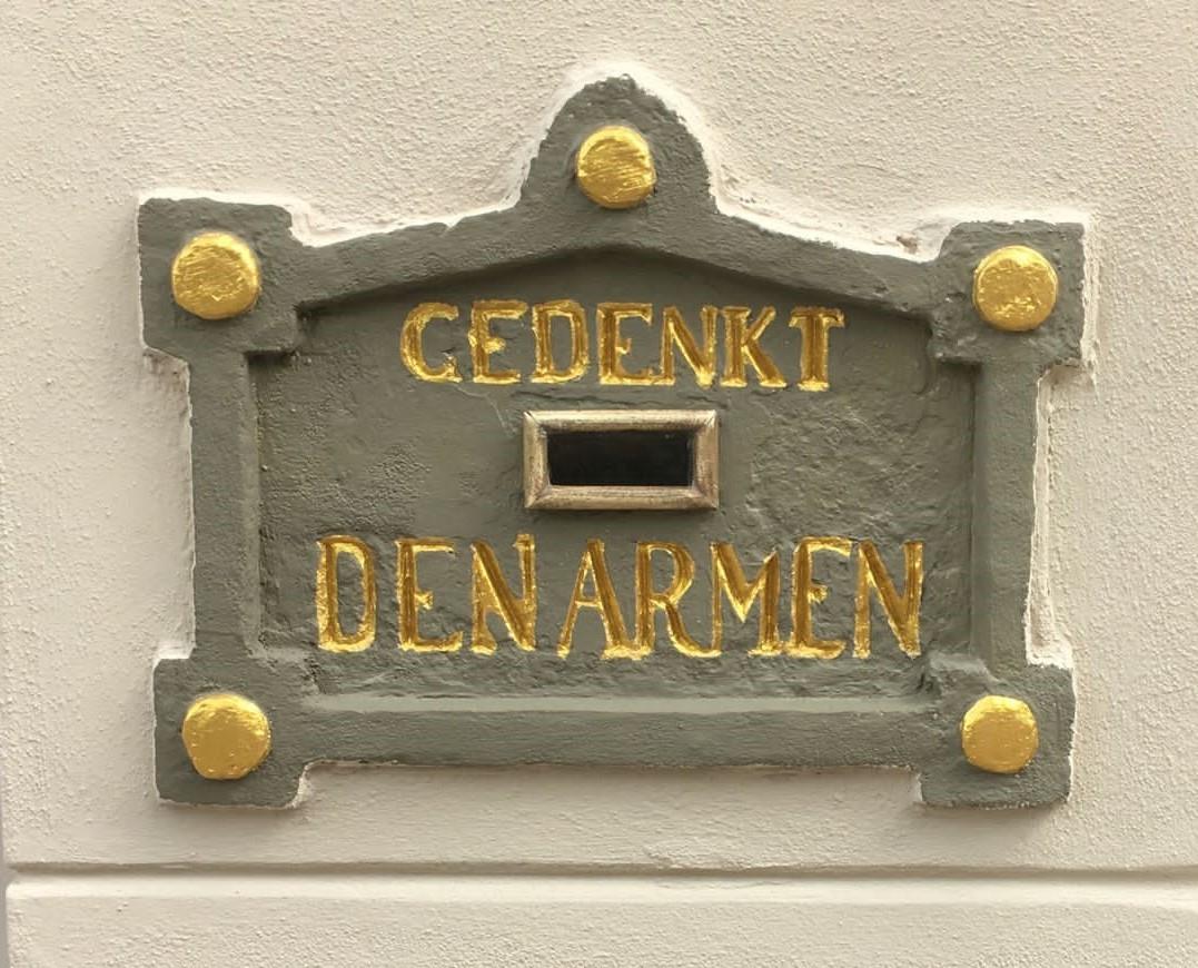 De bekende gevelsteen “Gedenkt den Armen” is gerestaureerd. De steen was ernstig beschadigd geraakt bij een enkele jaren geleden ontstane lekkage, waardoor de muren lange tijd drijfnat zijn geweest. De zouten uit de muur hebben de steen ernstig beschadigd, zodat deze grondig gerestaureerd moest worden. De Fa. Monks, die het herstel van het stucwerk binnen en buiten de aula onderhanden heeft genomen, heeft ook deze restauratie uitgevoerd. Tijdens de werkzaamheden werd er nog steeds geld in de collectebak aangetroffen. Het totale bedrag wordt door ons eens per jaar overgemaakt aan de Voedselbank Leiden.
